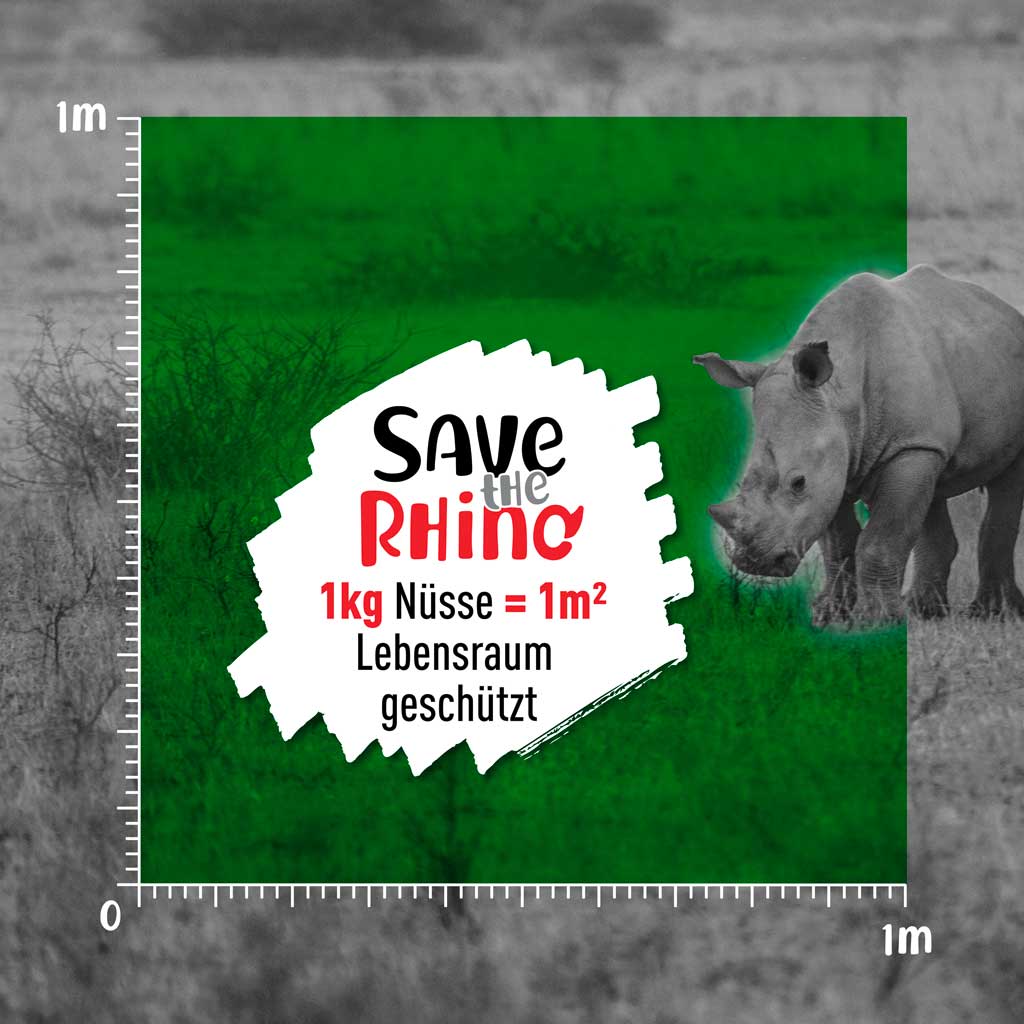 Mit jedem gekauften Kilogramm RED-RHINO Nüsse schützen Sie mit uns 1m² Lebensraum für Mensch und Tier, in Kooperation mit der Artenschutzstiftung des Zoos Karlsruhe.