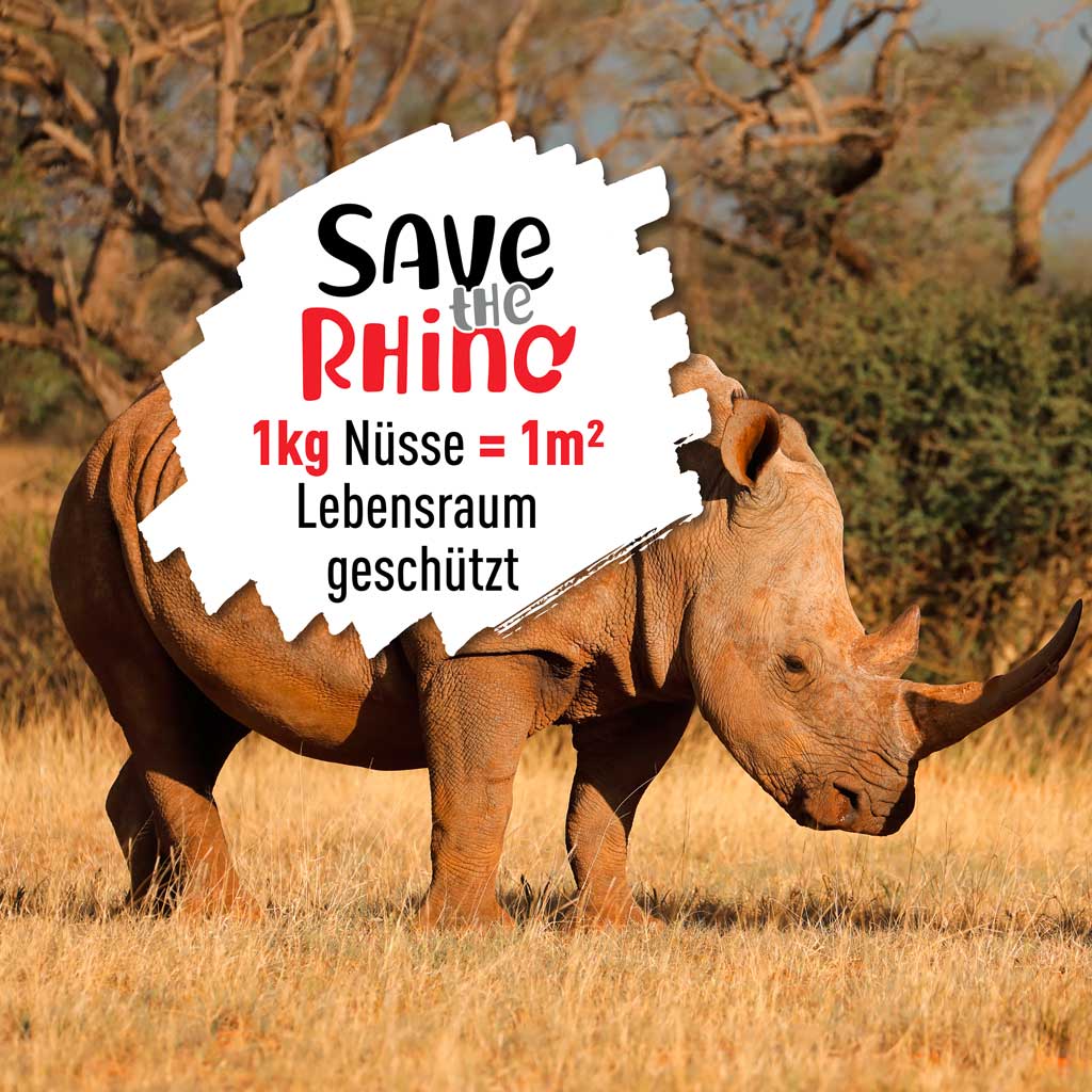 Das Red Rhino Projekt - SAVE THE RHINO – Mit jedem gekauften Kilogramm RED RHINO Nüsse schützen Sie mit uns 1m² Lebensraum für Nashörner, in Kooperation mit der Artenschutzstiftung des Zoos Karlsruhe.